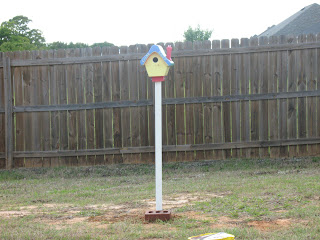 Brian's parents came down on Friday to visit for the w-end. They are known as Opa and Omi. Well, Opa is into woodworking, and he's always making birdhouses. So, he surprised Caleb and Micah with a birdhouse of their own. Today we headed to Home Depot to get the necessary supplies to put the birdhouse in the back yard. Caleb had lots of fun helping Opa get everything ready for the birdhouse.